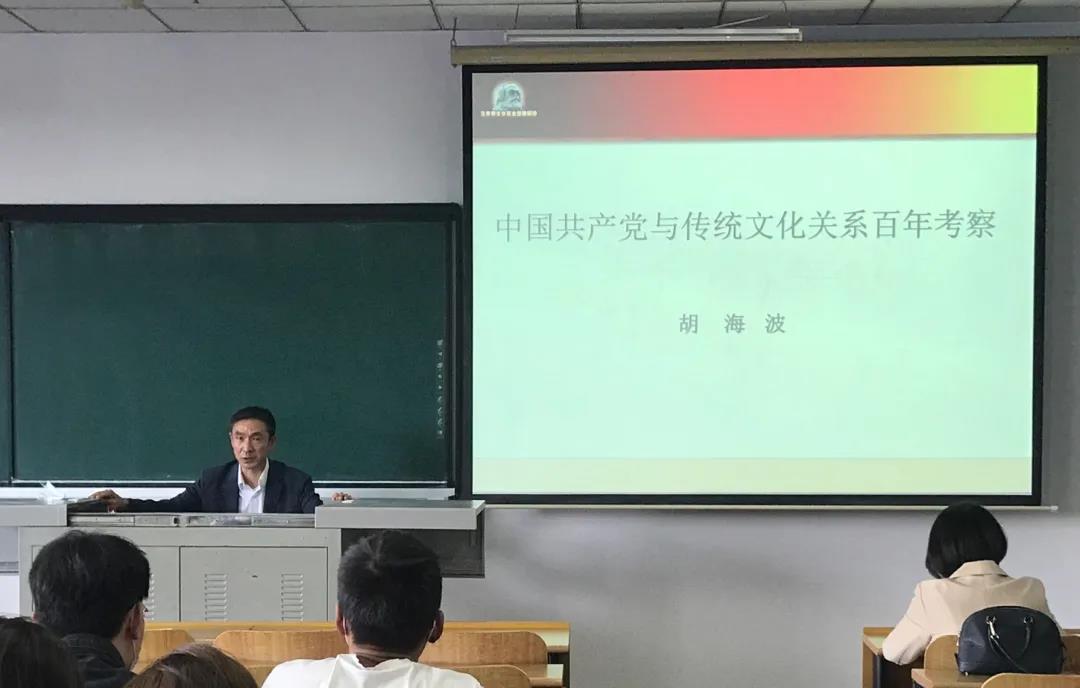 报告会上,胡海波教授首先对本次报告会的主题进行“破题”解读,讲述了中国共产党与传统文化在历史演变下的关系变化,系统阐述了怎样认识和分析马克思主义与中华传统文化两者之间的关系,并指出“中国共产党与传统文化关系的百年历史”内在地涵盖着中国共产党作用于传统文化的历史与优秀传统文化不断反作用于中国共产党及其实践的历史两个方面,是两个方面的有机统一。随后,分别从纵向、横向、现实价值三个方面深刻剖析了其研究意义。最后得出要将马克思主义与中华传统文化相结合这一结论。胡海波教授的演讲慷慨激昂,见解独到,细致入微,条理性强。现场的同学们也都听得十分专注,在互动环节里争先恐后回答老师提出问题。在火热的学术氛围中,副院长王晓光对报告内容进行总结。本次报告会在雷鸣般的掌声中圆满结束。