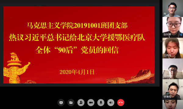 研究生党支部、各班级团支部积极开展了学习习近平总书记给北大援鄂医疗队全体“90后”党员回信精神线上分享活动。全体研究生党员和学生干部们一致认为,要牢记习近平总书记嘱托,以这次抗疫中“90后”的优秀代表为榜样,志存高远、忠于祖国,敢于担当、勇于奋斗,勤奋学习、锤炼身心,努力成为在新时代改革开放事业中可堪大用、能担重任的栋梁之才,让青春在党和人民最需要的地方绽放绚丽之花。