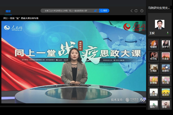 研究生党员邹丹说:“吉林战‘疫’思政课,让我们‘看’到了我省援鄂医护人员在抗疫一线的奋战与坚守、责任与担当,切身感受到全国人民在党中央坚强领导下万众一心、众志成城抗击疫情的强大力量。作为新时代青年,我们要树立远大理想、热爱伟大祖国、担当时代责任、勇于砥砺奋斗、练就过硬本领、锤炼品德修为,争做不负时代、不负人民的奔涌‘后浪’”。