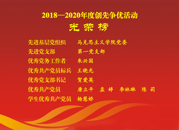 在2018—2020年度创先争优活动中,kaiyun开云官方党委荣获“先进基层党组织”称号;学院党委书记朱兴国被评为优秀党务工作者;第一党支部被评为先进党支部,贺爱英被评为优秀党支部书记;副院长王晓光被评为优秀共产党员标兵,唐立平、孟婷、李林琳、陈莉被评为优秀共产党员,杨慧娇被评为学生优秀共产党员。