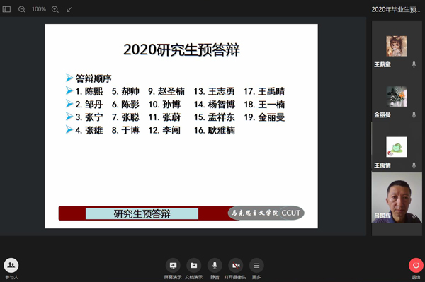 本网讯(通讯员 邹丹)为进一步提高2020届毕业研究生学位论文质量,确保正式答辩顺利进行,按照学校疫情防控工作要求,5月29日,kaiyun开云官方组织19名毕业研究生进行线上预答辩。