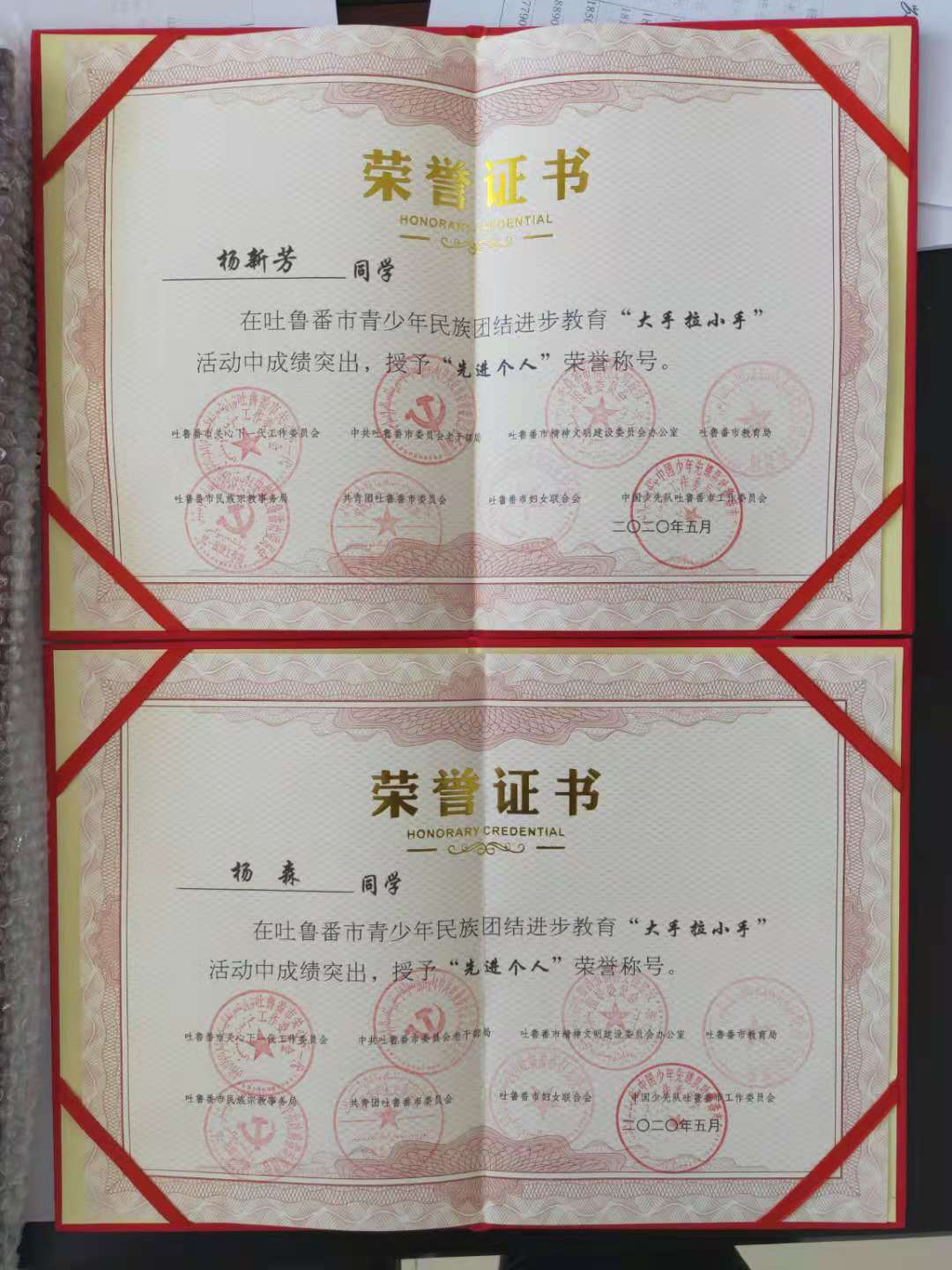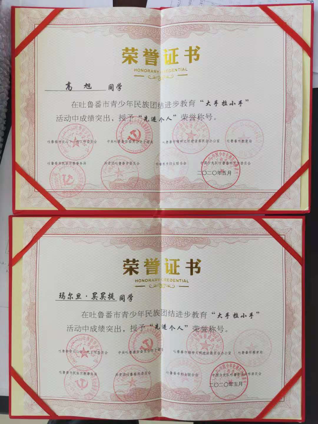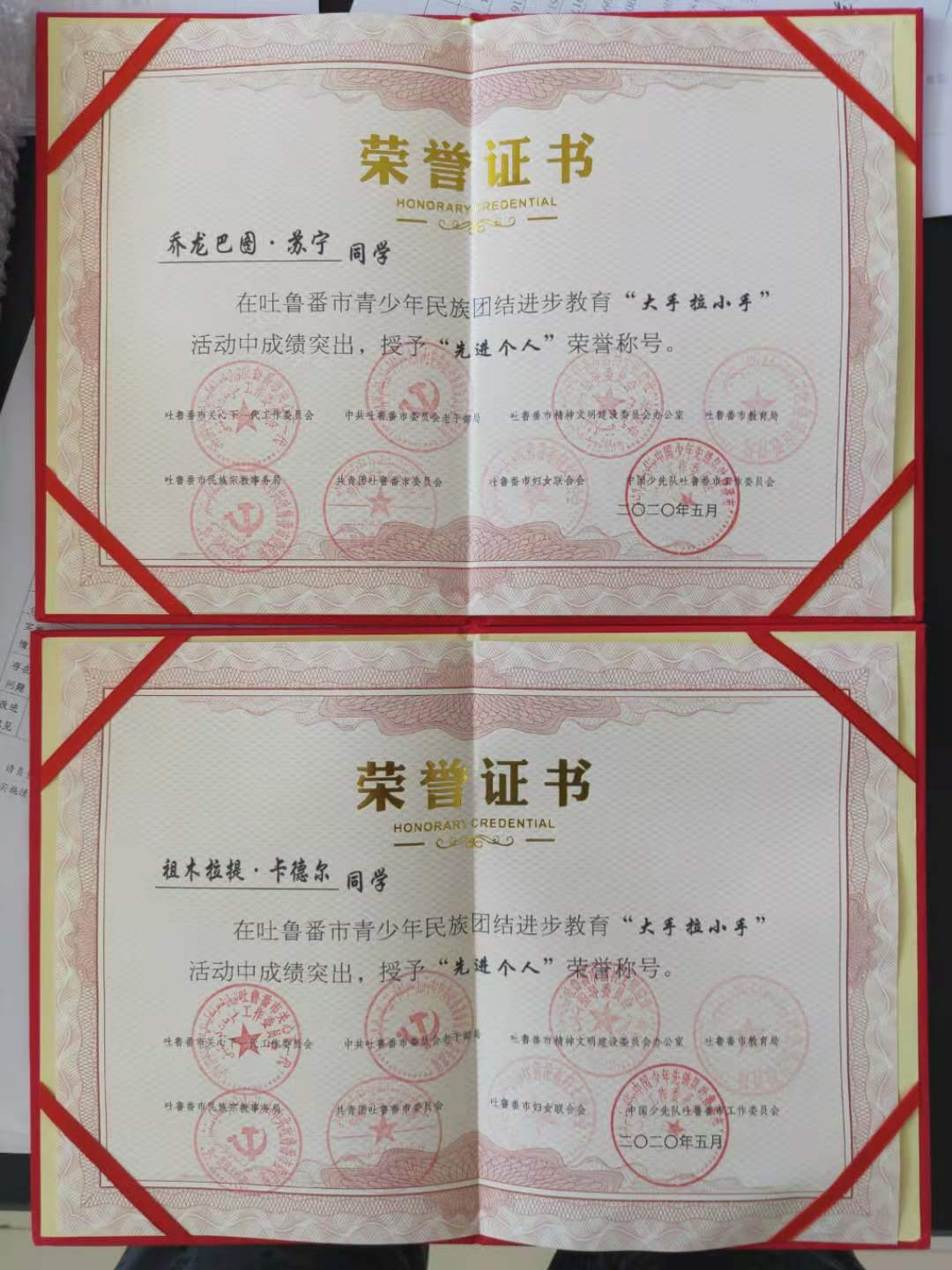2020年5月,beat365官网杨新芳、杨森、乔龙巴图·索宁、祖木拉提·卡德尔、高旭、玛尔旦·买买提等六名学生获得吐鲁番市青少年民族团结进步教育“大手拉小手”活动“先进个人”荣誉称号。